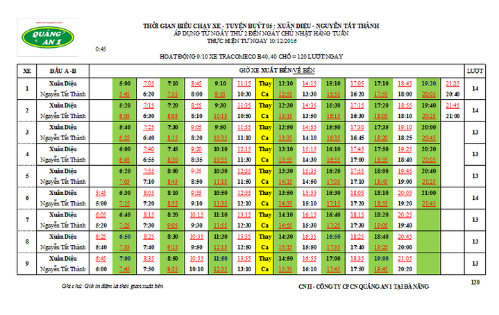 ![]() 운임은 1인당 5,000VND, 우대 대상용 1달 정기권은 4만 5000VND, 우대 대상 이외의 경우는 9만 VND. 5번 노선 노선 : Nguyen Tat Thanh >>> Xuan Dieu Nguy?n T?t Th?nh (Hoa Hiep Nam Apartment/ Nam ? Martket) ? Nguy?n T?t Th?nh (Area near Xu?n Thi?u tourist area)? Tr?n ??nh Tri ? Kinh D??ng V??ng ? L? Th?i T?ng ? D?ng S? Thanh Kh? ? Tr?n Cao V?n? ?ng ?ch Khi?m ? Thanh S?n ? L? T? Tr?ng ? ??ng ?a ?3/2 street ? Xu?n Di?u bus station. 회차: Xuan Dieu >>> Nguyen Tat Thanh Xu?n Di?u bus station? 3/2 street ? Tr?n Ph? ? Quang Trung ? Tr?n Cao V?n ? D?ng S? Thanh Kh? ? L? Th?i T?ng ? Kinh D??ng V??ng ? Tr?n ??nh Tri ? Nguy?n T?t Th?nh (Area near Xu?n Thi?u tourist area) ? Nguy?n T?t Th?nh (Hoa Hiep Nam Apartment/Nam ? Market). 운영시간 : 05:00 ~ 21:00 배차시간 : 10 분 (혼잡시) ~ 20 분 (일반) 운행횟수 : 120회/일 자세한 내용은 웹사이트 참조 : www.danangbus.vn 운행시간표 |